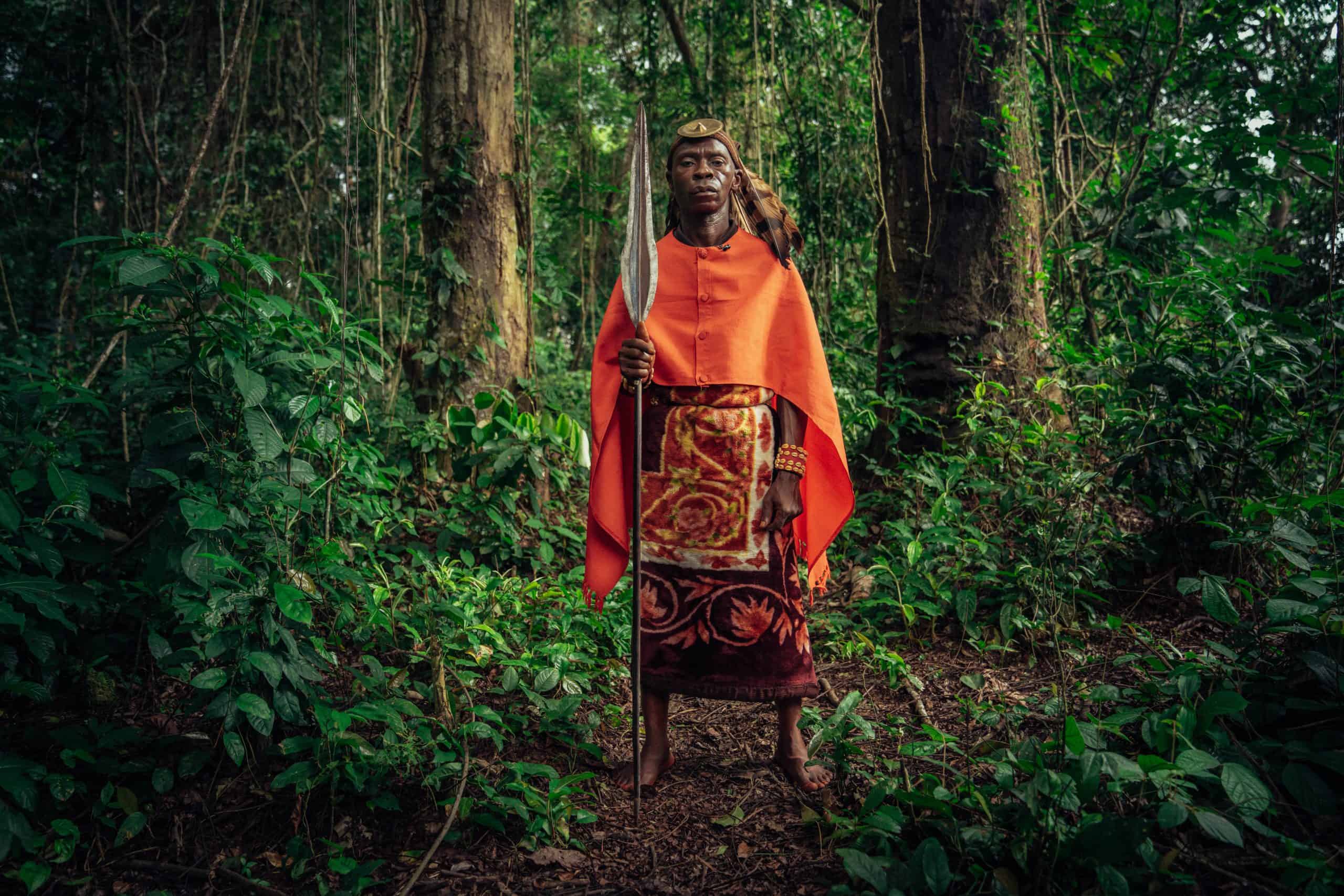 Note: The photo below is of Wilondo Baswa, Customary Chief of the Ntombezale tribe, Lobalu clan. The Customary Chief is the representative of the ancestors in his community. His clothes reflect ancestral power and are often worn during large traditional ceremonies. The eagle feathers and leopard skin represent ancestral strength, the red color represents power, and the ancestral spear or machete represents a warrior. Photo credit: Filip C. Agoo for Wildlife Works Carbon.
